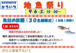 いつもご愛顧いただき誠にありがとうございます。 9月6日(土)に大好評のイベント「地魚まつり」を開催いたします! 旬の地魚の魚すくいがお楽しみいただけます。地魚の内容は当日のお楽しみ! 開催は10:00から、先着30名様 …