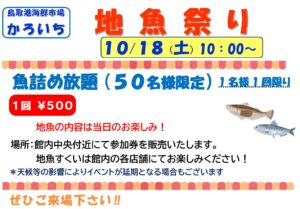 いつもご愛顧いただき誠にありがとうございます。 10月18日(土)に大好評のイベント「地魚まつり」を開催いたします! 旬の地魚の魚すくいがお楽しみいただけます。地魚の内容は当日のお楽しみ! 開催は10:00から、先着50 …
