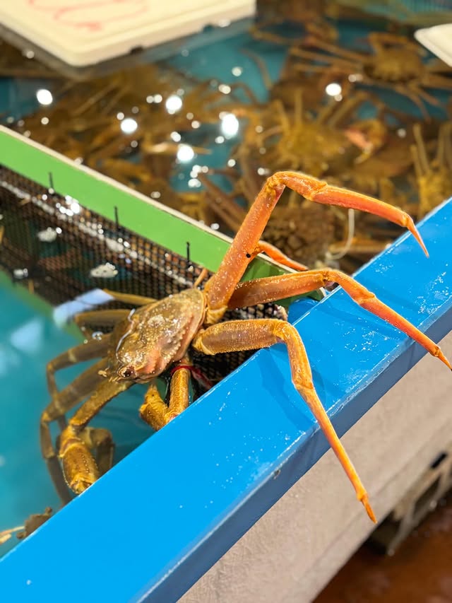 【冬の人気者】松葉がに お正月のにぎわいがひと段落したかろいちですが、 まだまだ松葉がにの季節です。 水槽の中の松葉がには… じっとしていたかと思えば、ひょっこり動き出したり。 のぞいてみるたびに、いろんな動きを見せてくれる 鳥取の冬の人気者🦀 ぜひ、冬の空気を感じられるかろいちの売り場へ お立ち寄りくださいませ🤗
