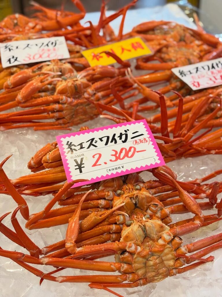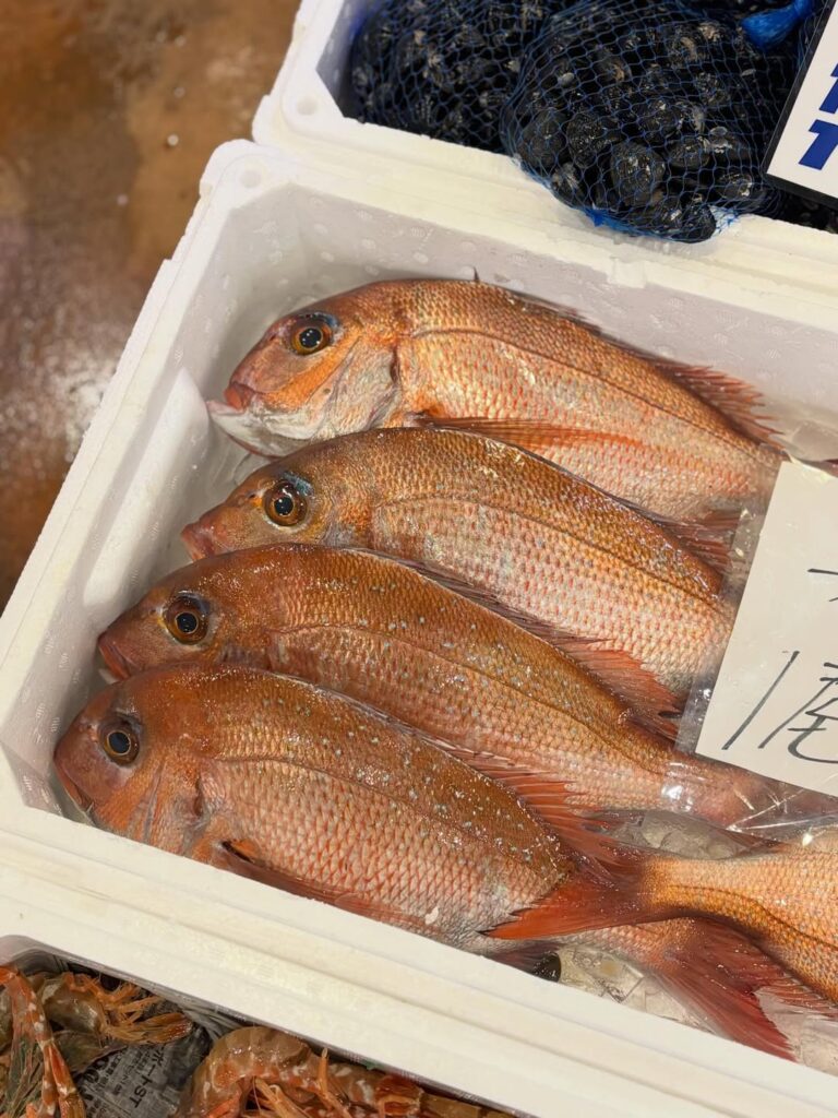 この時期もおいしいカニやタイが並びます。
